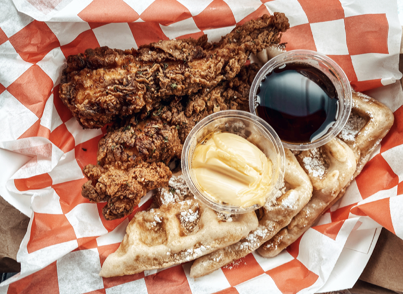 Chicken wings are the main thing, but served alongside are an overflow of tasty sauce options! Alabama White Sauce, Cajun Ranch, and Nashville Hot are three of the ten available. Have your chicken as a sandwich, salad, or with side of buttery waffles.