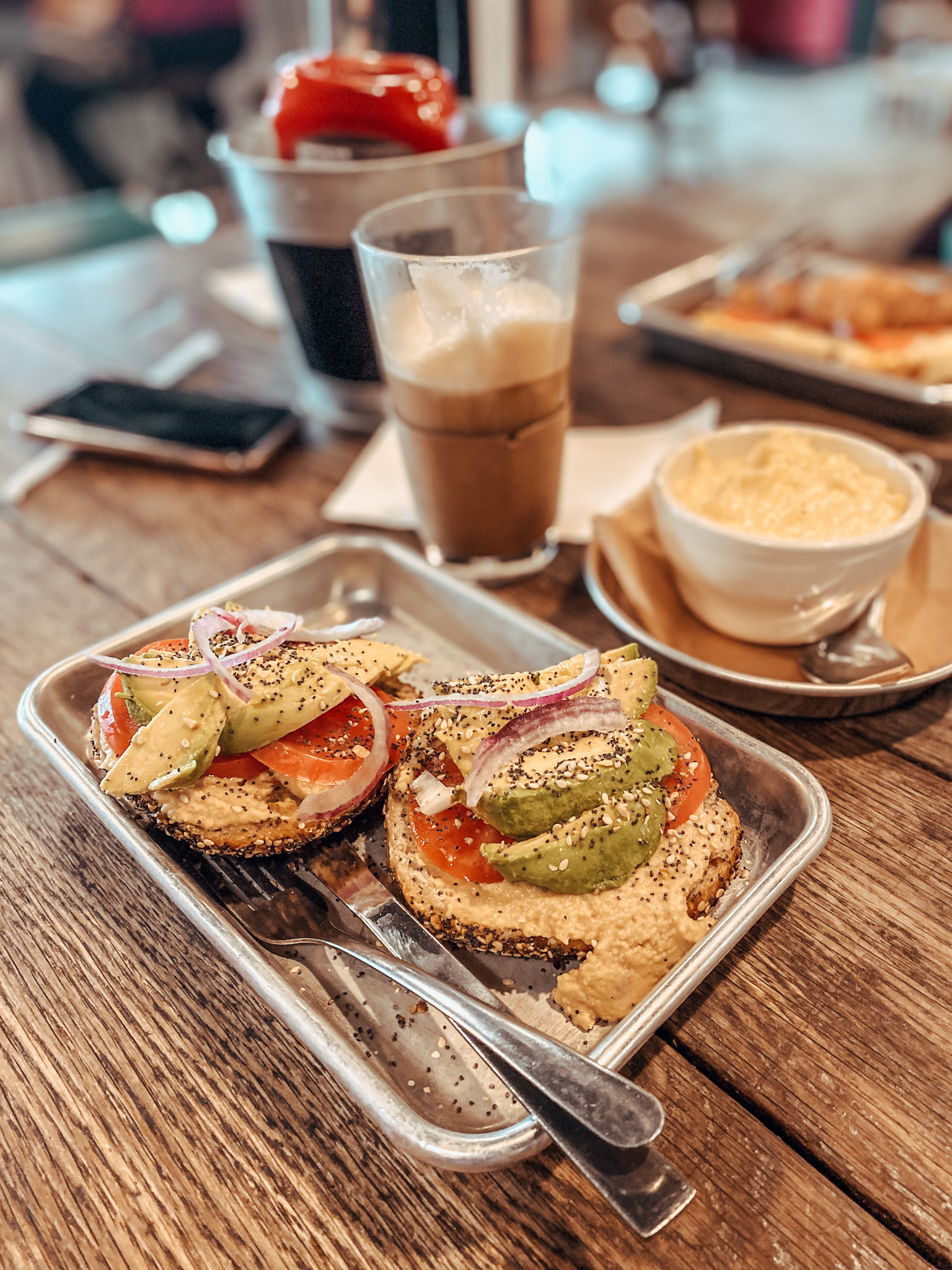 Veggie Bagel: hummus, tomato, avocado, onion, sprinkled with everything mix, served on an open faced toasted house made bagel.